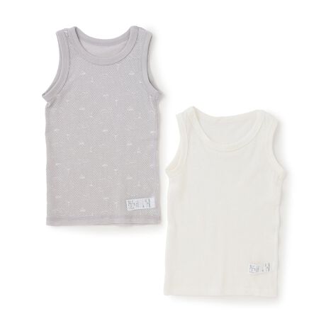 さまざまなモチーフをデザインしたタンクトップタイプの肌着です。毎日の洗い替えに重宝するうれしい2枚組。生地を弱酸性に保ち、外部の刺激からやさしく守る加工をほどこしています。メッシュタイプなので通気性が良く、暑い時期でも快適な着心地です。外側にお名前を記入できるタグつき。