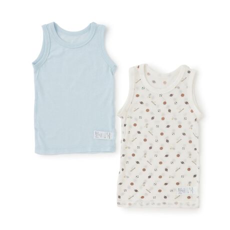 さまざまなモチーフをデザインしたタンクトップタイプの肌着です。毎日の洗い替えに重宝するうれしい2枚組。生地を弱酸性に保ち、外部の刺激からやさしく守る加工をほどこしています。メッシュタイプなので通気性が良く、暑い時期でも快適な着心地です。外側にお名前を記入できるタグつき。