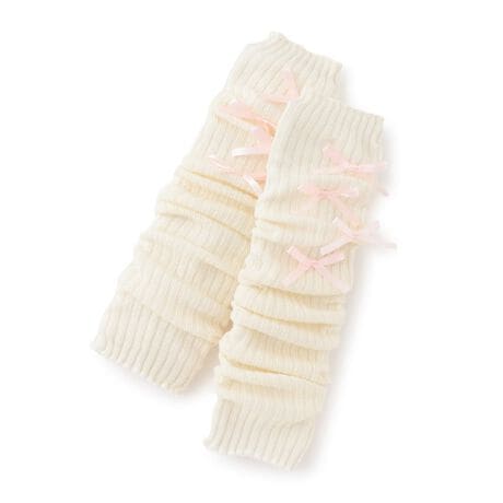 細めのリボンをちりばめた可愛らしいレッグカバーです。幅広いコーディネートに取り入れやすいシンプルなカラーリング。伸縮性のあるリブ編みで脚にフィットするため、ズレ落ちにくいのもうれしいポイントです。ミニスカートや厚底のスニーカーなど、カジュアルなアイテムとも相性良く決まります。