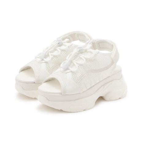 足元にボリューム感をプラスする厚底のサンダルです。合皮素材やメッシュ生地を用いたアッパーのデザインが特徴的。面ファスナーのベルトとドローコードで締めつけ具合を調節できます。カジュアルコーデから女の子らしいスタイリングまで、幅広い着こなしにマッチするアイテムです。≪重さ≫M/片足約379g