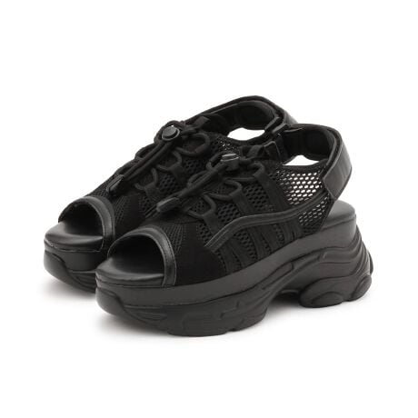 足元にボリューム感をプラスする厚底のサンダルです。合皮素材やメッシュ生地を用いたアッパーのデザインが特徴的。面ファスナーのベルトとドローコードで締めつけ具合を調節できます。カジュアルコーデから女の子らしいスタイリングまで、幅広い着こなしにマッチするアイテムです。≪重さ≫M/片足約379g