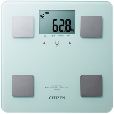 表示:体重、BMI(4段階)、体脂肪率(4段階)、筋肉量、基礎代謝量、内臓脂肪レベル(3段階)、推定年齢、