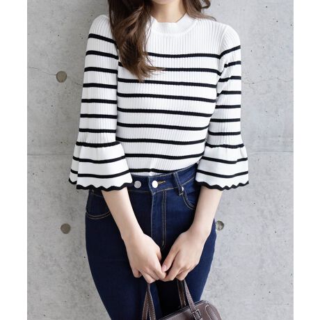 袖のフレア感がかわいい!五分袖スカラップニットトップス