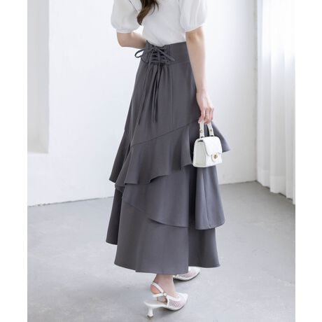 アシンメトリーな切り替えとマーメイドシルエットが、動きのある女性らしさを演出するスカートです。バックスタイルにはレースアップを施し、さりげなくウエストラインを引き締めてくれます。裾に向かって広がるラインで、スタイルアップ効果も期待できる一枚です。