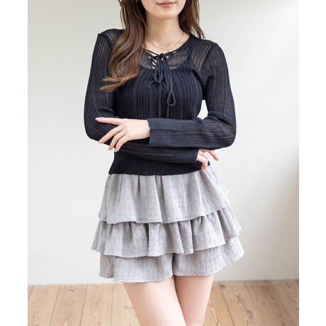 シンプルなのにちゃんと盛れる!レースアップ透かし編みニットトップス