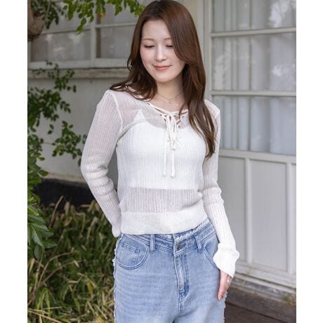シンプルなのにちゃんと盛れる!レースアップ透かし編みニットトップス