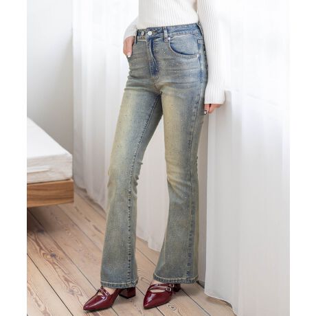 大人気のフレアデニムパンツにラインストーンがほどこされたパンツで、動くたびにキラキラと輝き華やかな印象に♪