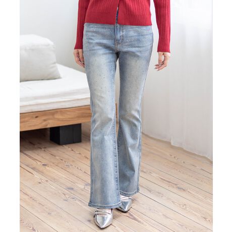 大人気のフレアデニムパンツにラインストーンがほどこされたパンツで、動くたびにキラキラと輝き華やかな印象に♪