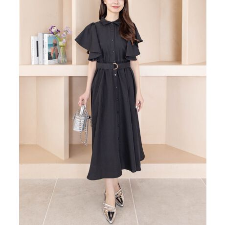 女性らしい!ウエストベルトフリルスリーブワンピース