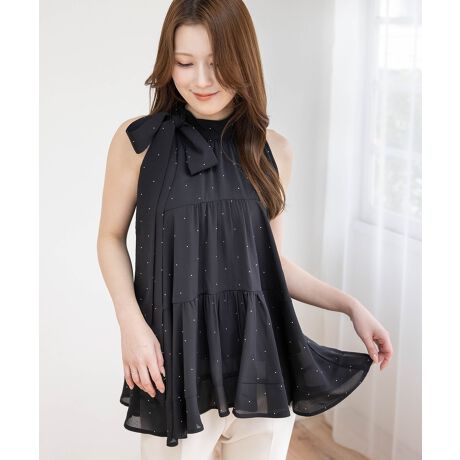 さりげなく輝く上品ブラウス♪ラインストーン付きボウタイリボンティアードブラウス