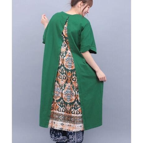 背中からちらりと覗く柄が印象的な、大人のゆるワンピース。