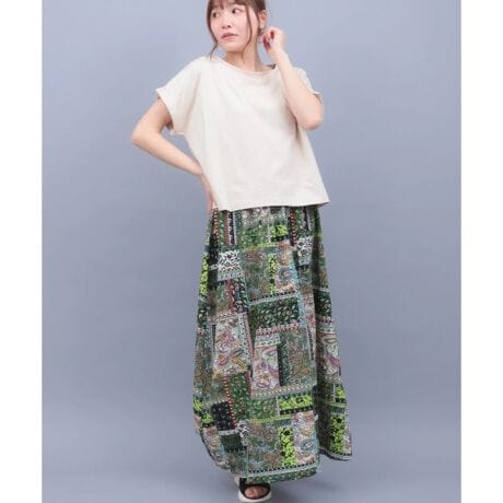 トップスはルーズなTシャツデザインで、リラックス感のある着心地に。