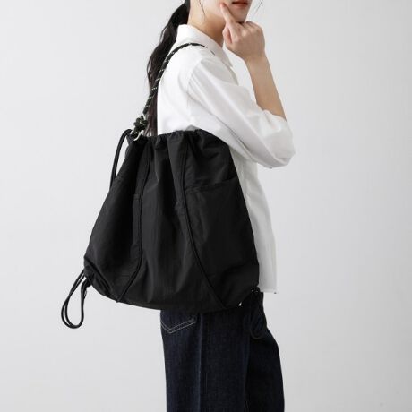 サイドのコードを絞ればナップサックとしても使えるデザインで、シーンやスタイリングに合わせて持ち方を変えられます。