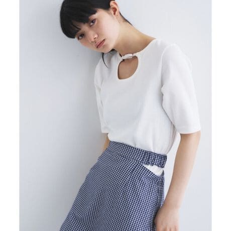シンプルながらも、首元のカッティングが女性らしいヘルシーなラインを美しく際立たせます。