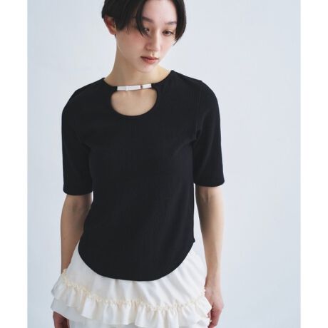 シンプルながらも、首元のカッティングが女性らしいヘルシーなラインを美しく際立たせます。
