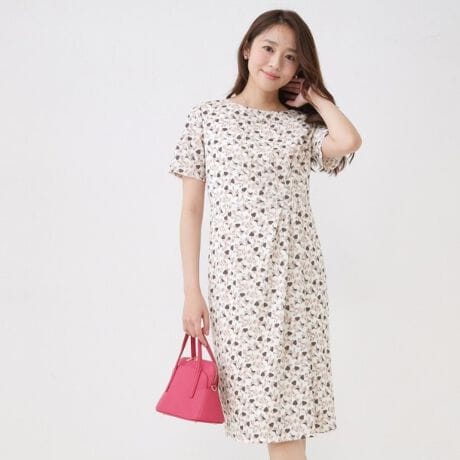 ウエスト切り替えより上下放射状のタック入れて、くびれが強調されメリハリのある女性らしい美しいラインがポイントになります。