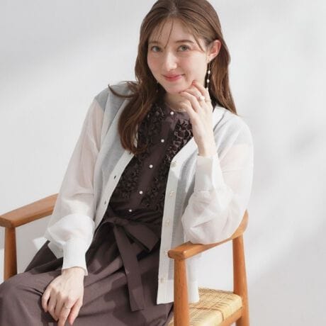 ダブルパール調釦がアクセントのシアーニットカーディ