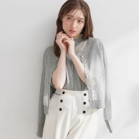 ダブルパール調釦がアクセントのシアーニットカーディ