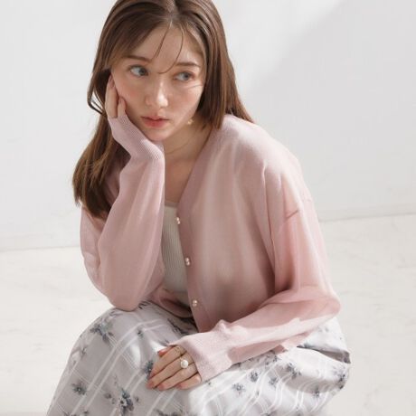 ダブルパール調釦がアクセントのシアーニットカーディ