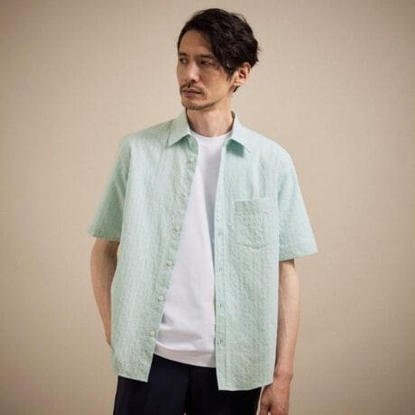 立体感あるドビー組織の凹凸に、さらにシボ感を出すことで見た目の奥行きと清涼感、着心地の快適さを両立させました。