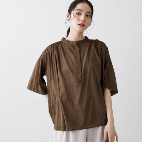 5分袖×ノーカラーのすっきりとしたデザインで、着回しやすさも魅力。
