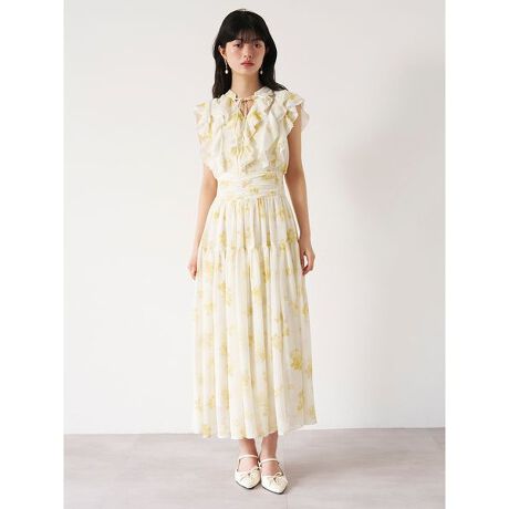 <b>【贅沢なラッフルと花柄が春を呼ぶ、スタイルアップを叶えるシフォンワンピース】</b>
