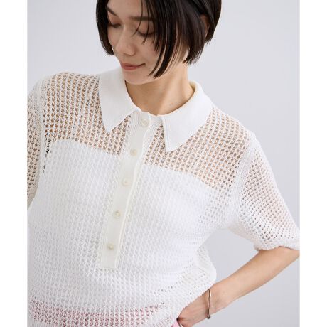 繊細なメッシュ編みが一枚でも存在感を放ち、シアー素材ながら程よいハリ感で体のラインを拾いにくいのもポイント。