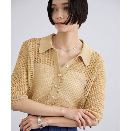 繊細なメッシュ編みが一枚でも存在感を放ち、シアー素材ながら程よいハリ感で体のラインを拾いにくいのもポイント。