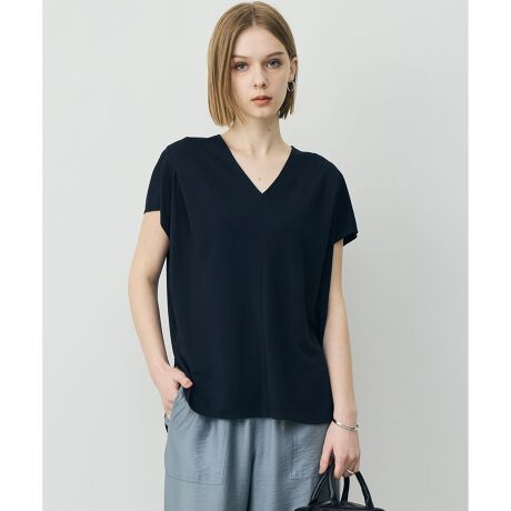 ■デザイン独特なタッチが心地よい機能素材を使用したデザイントップスです。すっきりとしたVネックが、デコルテラインを美しく見せてくれます。程よくゆとりを持たせた身頃に、肩にタックを入れたフレンチスリーブで、気になる二の腕を自然にカバーするデザインに仕上げました。どんなボトムスともバランスよく決まる着丈で、一枚でさらりと着こなすのはもちろん、ジャケットのインナーとしてもすっきり決まります。