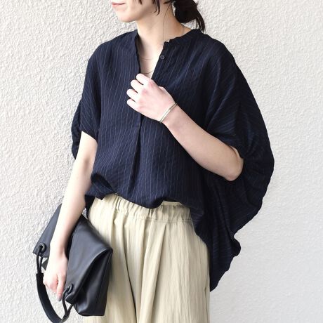 細かなダブルストライプがきちんと感を演出しつつ、コクーンシルエットで程よくリラックス感のある一枚。