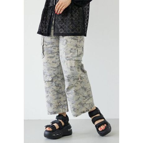 ■ポイントヴィンテージのカーゴパンツの着想を得て現代的なシルエットに昇華させたカーゴパンツ。腰回りのジャストフィットから裾にかけてフレアさせるシルエットでスタイルアップが叶う1本。迷彩柄やデジタルカモ柄など2000年代初期を彷彿とさせるアイテム。■ディテールパラシュートボタンやポケットの縫製等こだわりが随所に見られるアイテム。パンツ内側にはテープが付き裾をロールアップできるよう仕様に。また裾にはドットボタンが付き裾幅を調整できます。■スタイリングTシャツやタンクトップを合わせるだけでも決まります。クロップドトップスやパーカーと合わせたストリートコーディネートはもちろん、グランジスタイルやテックスタイルとも相性抜群。■生地無地は硫化染めリップストップ、柄はプリント入りリップストップを使用しています。■透け感:なし■裏 地:なし■伸縮性:なし■光沢感:なし※お取り扱い上のご注意加工の特性上、個体差がございます。パラシュートボタンには加工によるキズが見られる場合があります。[注意事項]※画像の商品はサンプルです。実際の商品と仕様、加工が若干異なる場合があります。※画像の商品は光の照射や角度、お使いのモニター環境により、実物と色味が異なる場合がございます。※着用、お取り扱いの際は、アテンションタグをご確認ください。