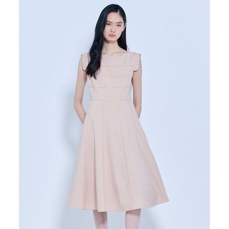 クラシカルな気品を感じさせる、端正なデザインのドレス。身頃には横方向の切り替えディテールを施し、シンプルな中にも奥行きのある表情をプラス。視線を上に引き上げる効果があり、上半身をすっきりと見せます。また、スカート部分にも縦のラインを強調する切り替えディテールをあしらい、全体に統一感を持たせました。自然な分量感を持たせつつ、広がりすぎない美しいフレアシルエットが洗練された印象を与えます。肩をやさしく包み込むフレンチスリーブ風のデザインが、女性らしい柔らかさと上品さを演出。甘さを抑えたフェミニンさで、通勤やきちんとしたお出かけなど、幅広いシーンに対応する一着です。カーディガンやジャケットを羽織ってもバランス良く決まるので、ロングシーズンお召しいただけます。