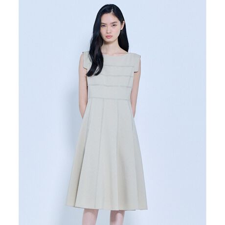 クラシカルな気品を感じさせる、端正なデザインのドレス。身頃には横方向の切り替えディテールを施し、シンプルな中にも奥行きのある表情をプラス。視線を上に引き上げる効果があり、上半身をすっきりと見せます。また、スカート部分にも縦のラインを強調する切り替えディテールをあしらい、全体に統一感を持たせました。自然な分量感を持たせつつ、広がりすぎない美しいフレアシルエットが洗練された印象を与えます。肩をやさしく包み込むフレンチスリーブ風のデザインが、女性らしい柔らかさと上品さを演出。甘さを抑えたフェミニンさで、通勤やきちんとしたお出かけなど、幅広いシーンに対応する一着です。カーディガンやジャケットを羽織ってもバランス良く決まるので、ロングシーズンお召しいただけます。