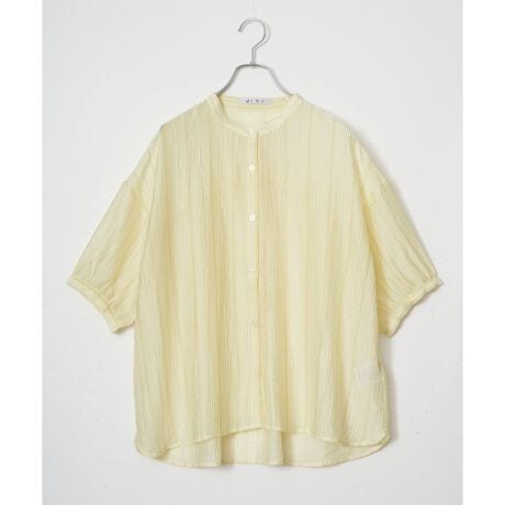 [型番:26012879]涼しげで清涼感のある楊柳生地で繊細に仕上げたブラウス。軽やかで肌ばなれのいい生地で汗ばむ季節も着こなしやすいアイテムです。バックにシャーリングをあしらい動くたび揺れるようなギャザーが印象的です。