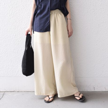 ダブルストライプ生地を使用した、イージーパンツ。