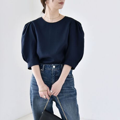 着心地:肌離れの良いドライタッチな質感。軽くさらっと着られます。ボリューム袖が存在感たっぷりで主役に。ボトムはシンプル合わせが◎
