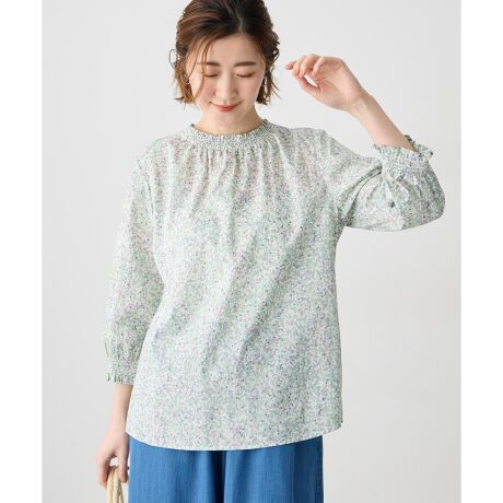 [型番:523293]顔まわり華やぐリバティ衿フリル衿元のシャーリングフリルがポイントの定番ブラウス。リバティならではの繊細な柄とやわらかな肌触りで、着るだけで上品な印象に仕上がります。一枚でさらっと着るのはもちろん、カーディガンやジャケットのインナーに合わせて衿を見せる着こなしもおすすめです。シンプルなボトムと合わせるだけでバランスよくまとまります。