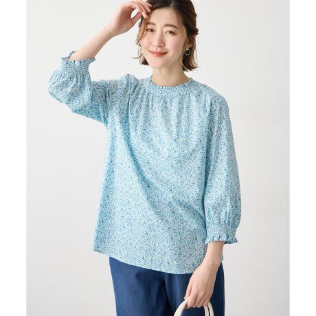 [型番:523293]顔まわり華やぐリバティ衿フリル衿元のシャーリングフリルがポイントの定番ブラウス。リバティならではの繊細な柄とやわらかな肌触りで、着るだけで上品な印象に仕上がります。一枚でさらっと着るのはもちろん、カーディガンやジャケットのインナーに合わせて衿を見せる着こなしもおすすめです。シンプルなボトムと合わせるだけでバランスよくまとまります。