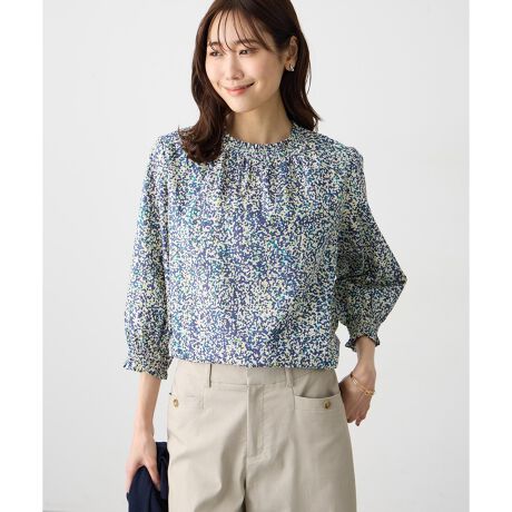 [型番:523293]顔まわり華やぐリバティ衿フリル衿元のシャーリングフリルがポイントの定番ブラウス。リバティならではの繊細な柄とやわらかな肌触りで、着るだけで上品な印象に仕上がります。一枚でさらっと着るのはもちろん、カーディガンやジャケットのインナーに合わせて衿を見せる着こなしもおすすめです。シンプルなボトムと合わせるだけでバランスよくまとまります。
