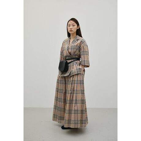 [型番:500JSB30-1921]モデル身長163cm(FREEサイズ着用)オリジナル柄のシアーチェック素材を使用した半袖ジャケット。透け感のある軽やかな素材に加え、ウエストタックを施すことで構築的なシルエットを実現。シンプルなコーディネートにプラスするだけで、さりげない個性と上品さを演出できる一着です。500JSB31-1671(シアーチェックスカート)とセットアップ着用可能。ストレッチなし、透け感あり。【お手入れ方法】手洗い可