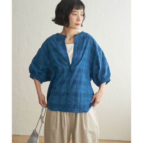 [型番:26012875]肘までふんわり隠れるスリーブとすっきり見えるちょうどいい着丈でサマ見えするブラウス。透け感のあるシャドーチェックで表情豊かに着こなせます。前後で着用可能、さらに羽織りとしても使える3WAY仕様です。