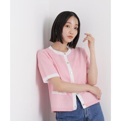 バイカラーデザインとゴールドボタンが目を惹く、上品な半袖ニットカーディガン。前を閉じてプルオーバー風にも、さらっと羽織ってジャケット感覚でも着こなせる、着回し力の高い一枚です。