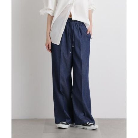 着心地の良い抜け感のあるデニム素材のパンツ。ややワイドなシルエットで、センタープレスも入っているのでカジュアル過ぎずON/OFFで合わせやすいデザイン◎リラックス感のあるウエストゴムで快適な着心地を楽しめるのも魅力です。
