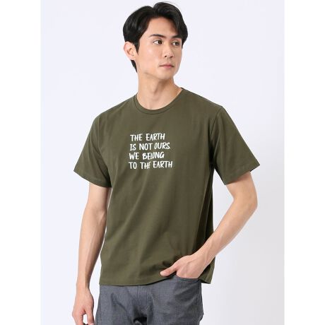 シンプルで大人っぽい雰囲気に仕上げた、クルーネックの半袖Tシャツです。メッセージロゴは「地球は人間のもの(所有物)ではなく、人間が地球の一部である」という意味です。綺麗目なインナーとしてシャツやジャケットインに最適な一枚です。
