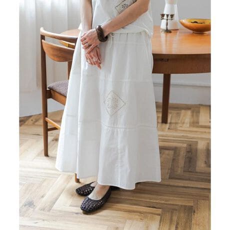 繊細な刺繍を施した生地をパッチワークで繋げたスカートは、大人ナチュラルな雰囲気を引き立てます。