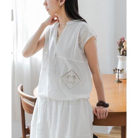 繊細な刺繍を施した生地をパッチワークで繋げたブラウスは、大人ナチュラルな雰囲気を演出します。