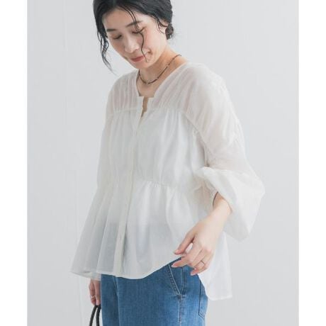 前後ともに美しい立体ギャザーが目を引くブラウスは、撥水・抗菌防臭機能を備えたコットンボイル素材を使用し、軽やかで快適な着心地を実現。