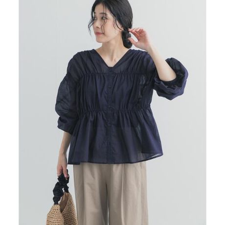 前後ともに美しい立体ギャザーが目を引くブラウスは、撥水・抗菌防臭機能を備えたコットンボイル素材を使用し、軽やかで快適な着心地を実現。