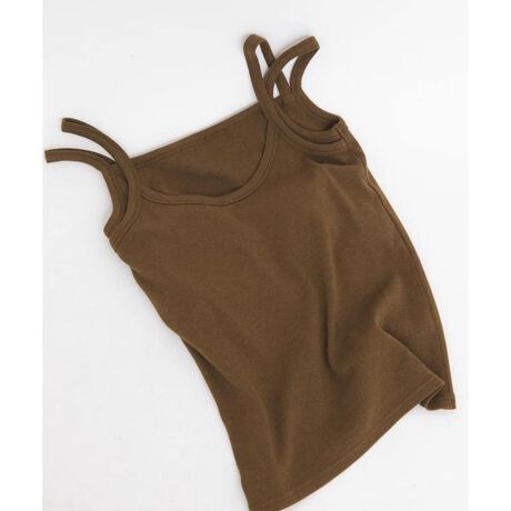 タンクトップをレイヤードしたデザインが特徴的なカップ付きアイテム。 伸縮性のある柔らかいリブを使用しているので着心地が良く、程よくしっかりとした素材は1枚でもヘルシーな着こなしが叶います。