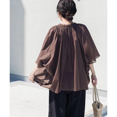 軽く清涼感のあるコットンボイル生地を使用したブラウスは、肩まわりや袖にかけてたっぷり入ったギャザーが程よいボリュームを出してくれるアイテム。